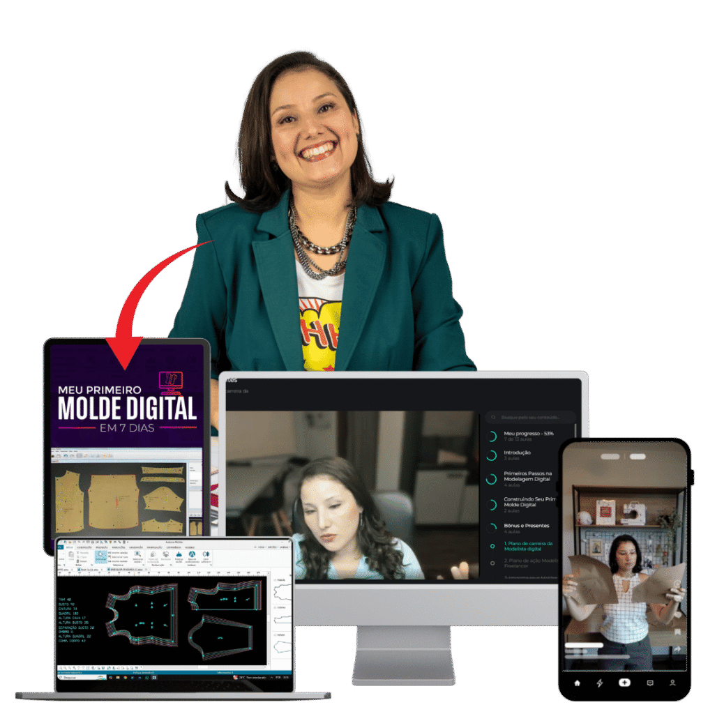 O que você precisa é de um passo a passo que você consiga seguir tranquilamente, no seu tempo e te leve do zero até seu primeiro molde digital, sem medo e sem pressão.